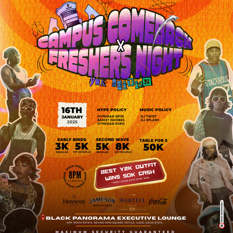 Get ready to step back into campus life with a bold statement! Campus Comeback × Freshers Night: Y2K Edition is the ultimate welcome bash for new students and a vibrant reunion for returning ones. Hosted by Flowz Entertainment, this night promises a luxurious ambiance, stunning aesthetics, and a carefully curated playlist that captures the electric nightlife energy of Ilaro. Embrace the Y2K vibe, connect with friends old and new, and immerse yourself in an unforgettable campus experience!